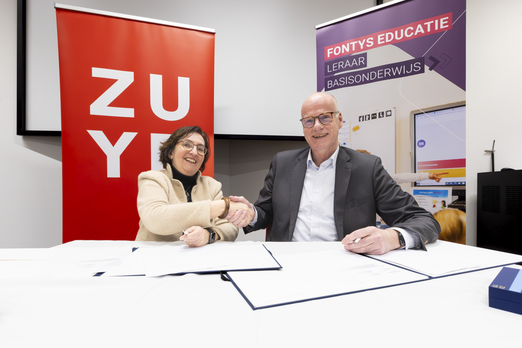 Fotobijschrift: De samenwerkingsovereenkomst tussen Zuyd en Fontys is 28 januari ondertekend bij de Nieuwste Pabo in Sittard door Saskia Brand-Gruwel, lid college van Bestuur van Zuyd Hogeschool en Joep Houterman, bestuursvoorzitter van Fontys.